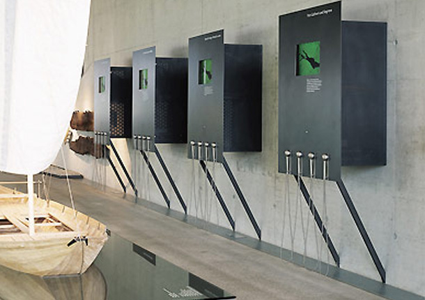 Eine Wandnische in der Außenhülle in der Form des rekonstruierten Lastenseglers ist sowohl Hintergrund für das fragmentarische Original als auch Sichtzeichen nach außen.